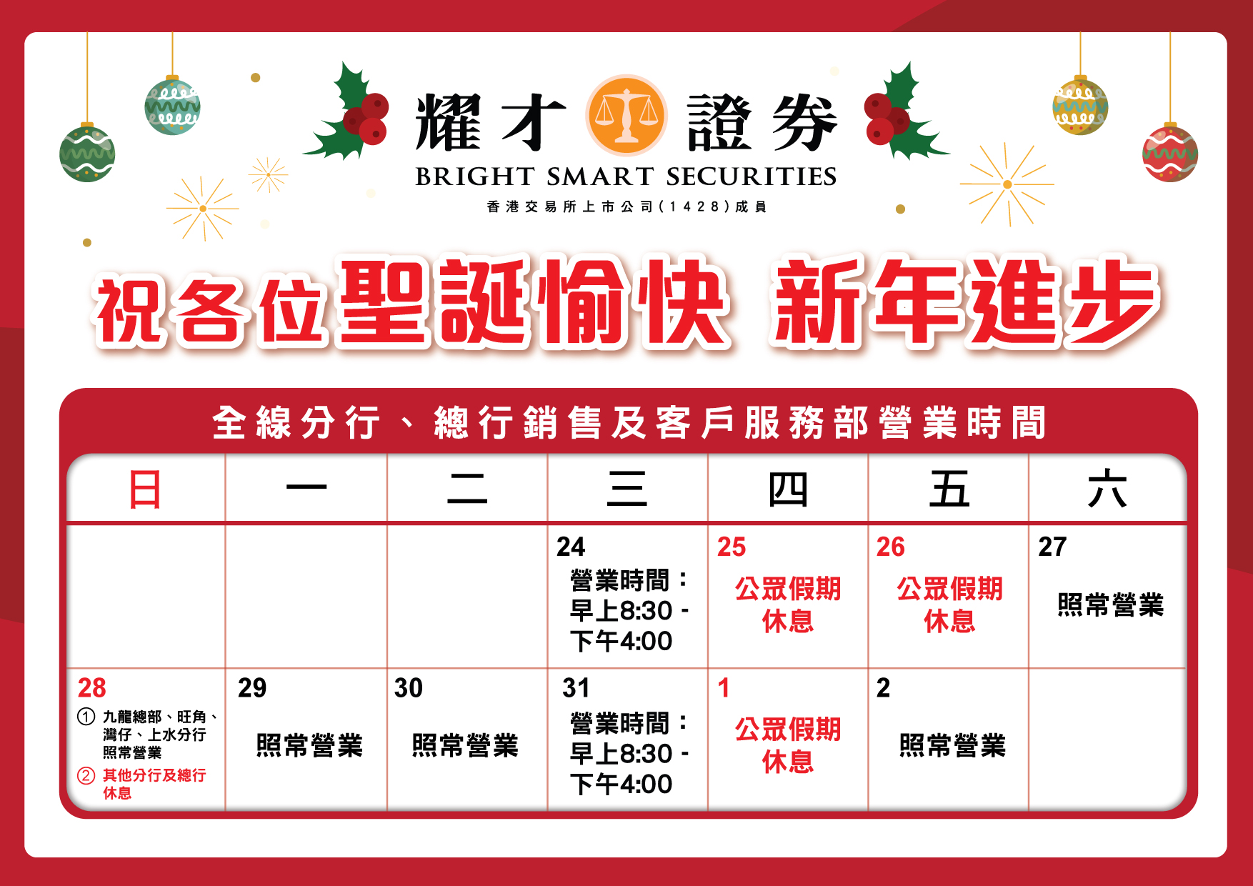 由於聖誕節前夕 (2025年12月24日) 及新年前夕 (2025年12月31日),香港交易所均不設下午交易時段,本集團全線分行,總行銷售及客戶服務部營業時間如下: