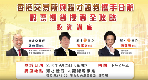 嘉賓: 芝商所客席講師 盧楚仁先生、芝商所客席講師 譚家康先生、法興證券上市產品銷售部董事 蔡秀虹小姐、博時國際ETF銷售經理 孔穎雯小姐、恒生投資ETF銷售經理 郭子杰先生、耀才證券執行董事兼行政總裁 許繹彬先生、耀才證券研究部總監 植耀輝先生